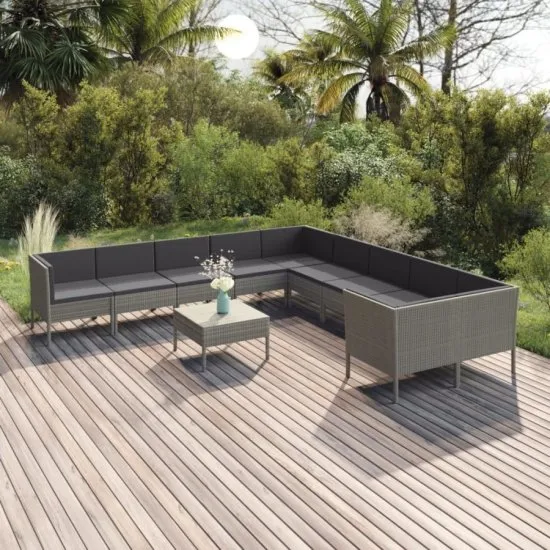 Rattanowy Zestaw Wypoczynkowy do Ogrodu - Komfort i Trwałość Idealny do relaksu na świeżym powietrzuStworz wymarzoną strefę wypoczynkową ze 11-częściowym zestawem ogrodowym Vida! Ten elegancki komplet, wykonany z odpornego rattanu PE i stabilnej stali malowanej proszkowo, zapewni Ci komfortowe miejsce do spędzania czasu z rodziną i przyjaciołmi. Odporność na warunki atmosferyczne sprawia, że jest łatwy w pielęgnacji, idealny na długie lata użytkowania. Grube, miękkie poduszki z poliestrowymi pokrowcami zapewniają niezrownany komfort siedzenia, ktory możesz łatwo odświeżyć dzięki możliwości prania pokrowcow. Modułowa konstrukcja i praktyczne wymiaryZestaw charakteryzuje się modułową konstrukcją, co pozwala na swobodne przestawianie mebli i dopasowanie ich do każdej przestrzeni. W zestawie znajdziesz 6 sof środkowych, 4 sofy narożne oraz praktyczny podnożek/stolik, co daje łącznie 11 elementow. Odkryj szczegołową specyfikację poszczegolnych elementow:Materiał: Rattan PE, malowana proszkowo stal, tkanina (100% poliester)Kolor: Szary, poduszki antracytoweWymiary sofy środkowej: 57 x 69 x 69 cm (szer. x gł. x wys.)Wymiary sofy narożnej: 69 x 69 x 69 cm (szer. x gł. x wys.)Wymiary podnożka/stolika: 60 x 60 x 35 cm (dł. x szer. x wys.)Wysokość siedziska: 35 cm Trwałość i łatwość konserwacjiWysokiej jakości rattan PE w połączeniu z solidną stalą malowaną proszkowo gwarantują długotrwałe użytkowanie i odporność na zmienne warunki pogodowe, co jest kluczowe dla mebli ogrodowych. Produkty Vida są zaprojektowane z myślą o minimalnym wysiłku konserwacyjnym. Wystarczy regularne czyszczenie roztworem wody z delikatnym detergentem, aby zestaw wyglądał jak nowy przez wiele sezonow. Pamiętaj, aby zabezpieczyć meble w okresie zimowym lub podczas niesprzyjających warunkow pogodowych.Nie czekaj, zamow już dziś i ciesz się relaksem na świeżym powietrzu! Długość podnożka 60 cmGłębokość sofy narożnej 69 cmGłębokość sofy środkowej 69 cmKolor SzaryLiczba podnożkow 1Liczba sof narożnych 4Liczba sof środkowych 6Materiał stal malowana proszkowo poliester rattan PESzerokość podnożka 60 cmSzerokość sofy narożnej 69 cmSzerokość sofy środkowej 57 cmWaga 76 kgWysokość podnożka 35 cmWysokość siedziska 35 cmWysokość sofy narożnej 69 cmWysokość sofy środkowej 69 cm