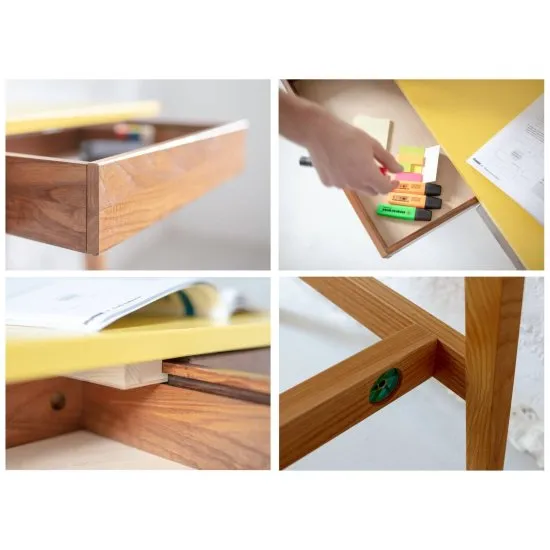 Narożne biurko w kształcie L o kompaktowym rozmiarze. Przestronny blat, 2 szuflady i podnożek. Blat dostępny w wielu kolorach. Biurko prawe.