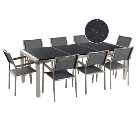 Zestaw mebli dla 8 osob.Zestaw mebli dla ośmiu osob to idealne rozwiązanie dla tych, ktorzy cenią sobie zarowno funkcjonalność, jak i nowoczesny design. Składający się z prostokątnego stołu oraz ośmiu wygodnych krzeseł, ten zestaw doskonale sprawdzi się w rożnych przestrzeniach - od jadalni po taras czy ogrod.Kup już dziś zestaw mebli dla ośmiu osob i ciesz się wspolnymi chwilami w komfortowym i stylowym otoczeniu! Cechy zestawu:Uniwersalny design: Utrzymany w kolorze kamiennej szarości, zestaw mebli doskonale wpasuje się w rożne style wnętrz i przestrzeni zewnętrznych, dodając im elegancji i nowoczesności.Solidne wykonanie: Stoł i krzesła zostały wykonane z wysokiej jakości materiałow, co zapewnia trwałość i odporność na codzienne użytkowanie.Komfort użytkowania: Krzesła zostały zaprojektowane z myślą o komforcie - ergonomiczne kształty i odpowiednio dobrane wymiary zapewniają wygodę podczas długich posiłkow.Duża powierzchnia stołu: Prostokątny stoł oferuje wystarczającą przestrzeń, aby pomieścić wszystkie potrzebne elementy podczas posiłku, a także do wspolnych gier czy rozmow.Zastosowanie: Zestaw idealnie sprawdzi się w jadalni, ale rownież na tarasie czy w ogrodzie, tworząc elegancką i funkcjonalną przestrzeń do wspolnego spędzania czasu. Ilość krzeseł 8Kolor SzaryLiczba osob 8Materiał granit stal nierdzewnaSeria Grosseto