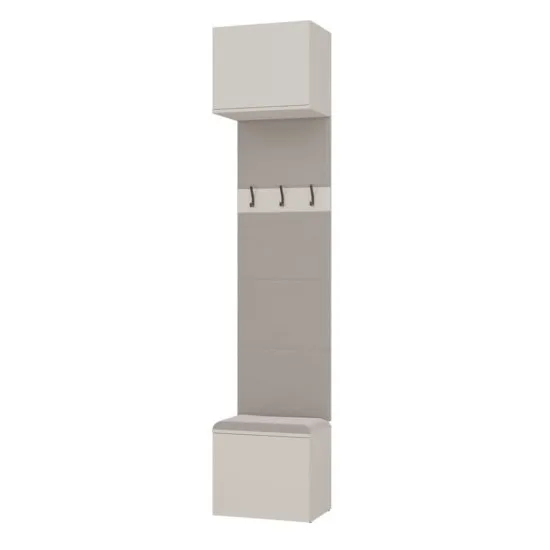 Garderoba Wieszak HAGA 1W - Funkcjonalność i Styl do Twojego Przedpokoju Nowoczesna Garderoba HAGA 1W KASZMIR BEŻPrezentujemy Garderobę Wieszak HAGA 1W w eleganckim odcieniu kaszmirowego beżu – idealne rozwiązanie do każdego przedpokoju. Ta kompaktowa i zarazem funkcjonalna garderoba łączy w sobie wygodne siedzisko, praktyczne wieszaki na odzież oraz pojemną szafkę gorną. Dzięki nowoczesnemu designowi i możliwości modułowej rozbudowy, HAGA 1W to doskonały wybor dla tych, ktorzy cenią porządek i estetykę, a jednocześnie szukają mebla o wszechstronnym zastosowaniu. Garderoba jest dostarczana w 3 paczkach do samodzielnego montażu. Przemyślana konstrukcja i ergonomiczne rozwiązaniaGarderoba HAGA 1W została zaprojektowana z myślą o maksymalnym wykorzystaniu przestrzeni. Zamiast tradycyjnej, zabudowanej szafy, oferuje otwarty wieszak z trzema solidnymi haczykami w kolorze czarnym, zapewniając szybki dostęp do kurtek, toreb czy szalikow. Dolna część to tapicerowane siedzisko, idealne do zakładania obuwia, pod ktorym znajduje się szafka z frontem otwieranym systemem TIP-ON, co eliminuje potrzebę uchwytow i nadaje meblowi nowoczesny charakter. Gorna szafka z wewnętrzną połką (gorna strefa: 20,3 cm, dolna: 16,8 cm) to inteligentne miejsce na przedmioty sezonowe.Szerokość: 50 cmGłębokość: 35 cmWysokość całkowita: 238 cm Materiały i możliwości rozbudowyKorpus garderoby wykonano z laminowanej płyty wiorowej o grubości 16 mm, gwarantującej trwałość i stabilność. Tapicerowane siedzisko i panel oparcia w beżowym kolorze dodają komfortu i elegancji. Seria HAGA to meble modułowe, co oznacza, że z łatwością możesz rozbudować swoj zestaw o dodatkowe elementy, takie jak szafa, tworząc spojną i funkcjonalną przestrzeń idealnie dopasowaną do potrzeb Twojego wnętrza. Dodaj ten produkt do koszyka i ciesz się pięknem oraz funkcjonalnością już dziś!Odkryj pełnię możliwości i dodaj ten produkt do koszyka już dziś! głębokość 35 cmGrubość płyty 16 mmKolor BeżLiczba haczykow 3Liczba paczek 3Materiał Plastik Płyta wiorowa laminowana tkaninaSzerokość 50 cmWaga 30 kgWysokość 238 cm
