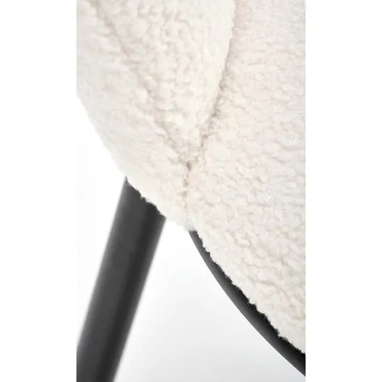 Siedzisko oraz oparcie pokryto modną tkaniną typu boucle w kremowym odcieniu, ktora nie tylko przyciąga wzrok swoją strukturą, ale także gwarantuje miękkość i komfort. Całość wsparta została na stalowej, malowanej proszkowo podstawie w kolorze czarnym – kontrastującej z jasnym obiciem i zapewniającej trwałość i stabilność użytkowania.