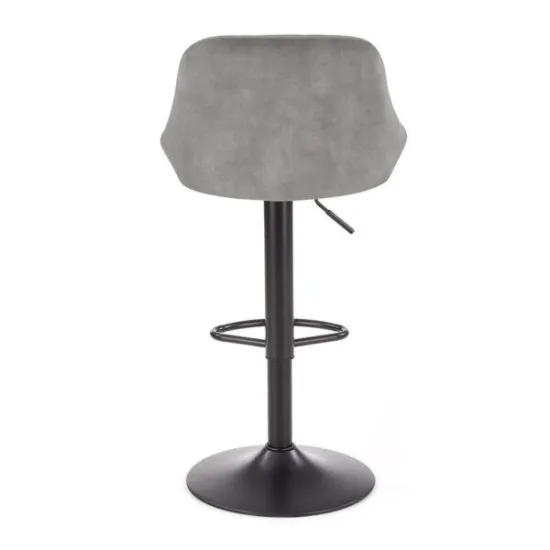 Hoker został wykonany z przyjemnej w dotyku tkaniny velvet w kolorze popielatym (BLUVEL 14), ktora pięknie załamuje światło i podkreśla geometryczne pikowania oparcia. Całość osadzona jest na czarnej, stalowej podstawie malowanej proszkowo, gwarantującej trwałość i stabilność podczas użytkowania.