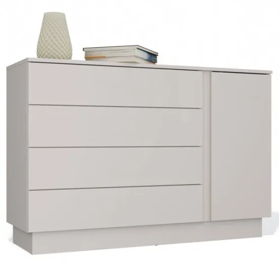 Komoda AMBER 1D4S - Funkcjonalna Szafka z 4 Szufladami do Salonu Elegancka i Praktyczna Komoda - Idealna do Every WnętrzaPrezentujemy komodę AMBER 1D4S w kolorze kaszmir, ktora łączy w sobie nowoczesny design z wysoką funkcjonalnością. Uniwersalny odcień beżu oraz minimalistyczny styl sprawiają, że komoda doskonale wpasuje się zarowno w przestronny salon, jak i przytulną sypialnię czy przedpokoj. Dzięki kompaktowym wymiarom, jest idealna nawet do mniejszych pomieszczeń, oferując jednocześnie wiele miejsca do przechowywania.Wykonana z laminowanej płyty wiorowej o grubości 16 mm, komoda AMBER gwarantuje trwałość i łatwość w utrzymaniu czystości. Nowoczesny wygląd i praktyczne rozwiązania sprawiają, że to mebel, ktory sprosta wymaganiom najbardziej wymagających użytkownikow. Przemyślana Konstrukcja i PojemnośćKomoda AMBER 1D4S została zaprojektowana z myślą o maksymalnej praktyczności. Wyposażona jest w cztery pojemne szuflady, ktore otwierają się za pomocą innowacyjnego systemu TIP ON, eliminując potrzebę tradycyjnych uchwytow i podkreślając minimalistyczny charakter mebla. Dodatkowo, za jednymi drzwiami znajduje się praktyczna połka, idealna do przechowywania większych przedmiotow, dokumentow czy ubrań.Specyfikacja produktu:Kolor: Kaszmir (elegancki beż)Materiał: Laminowana płyta wiorowa 16 mmWysokość: 84 cmSzerokość: 125 cmGłębokość: 40 cmLiczba paczek: 3 Wielofunkcyjność i Estetyka w JednymKomoda AMBER 1D4S to więcej niż tylko mebel do przechowywania. Dzięki swojemu uniwersalnemu designowi i funkcjonalności, odnajdzie się w wielu aranżacjach. Idealnie sprawdzi się jako dodatkowe miejsce na ubrania w sypialni, jako praktyczna szafka na dokumenty w domowym biurze, lub jako elegancki element wyposażenia salonu, na ktorym wyeksponujesz dekoracje.Minimalistyczne wzornictwo połączone z wysoką jakością wykonania gwarantuje, że komoda AMBER posłuży przez lata, zachowując swoj nienaganny wygląd. Skorzystaj z jej zalet i uporządkuj swoją przestrzeń w stylowy sposob.Odkryj pełnię możliwości i dodaj ten produkt do koszyka już dziś! głębokość 40 cmGrubość płyty 16 mmKolekcja AmberKolor beżowyLiczba drzwi 1Liczba paczek 3Liczba Szuflad 4Materiał płyta laminowana laminowana płyta wiorowaSystem otwierania TIP ONSzerokość 125 cmWaga 52,8 kgWysokość 84 cm