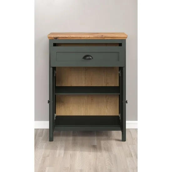 Kolorystyka: ciemnozielony korpus i front w połączeniu z blatem dębowym evoke, dodający elegancji i ciepła wnętrzu.