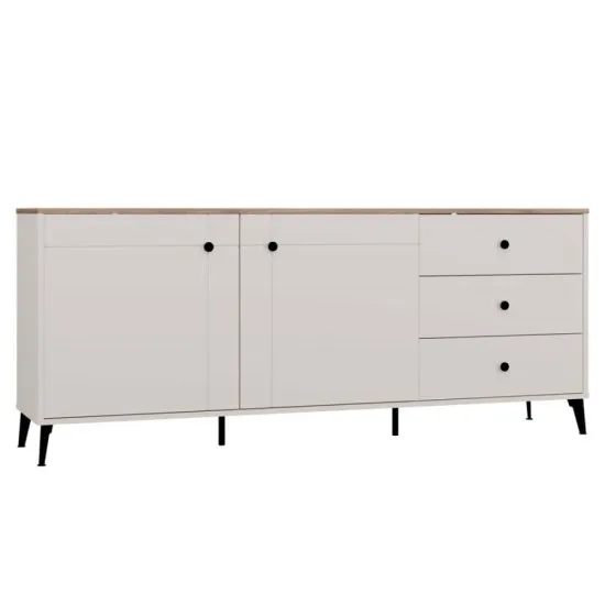 ELEGANCKA SZEROKA KOMODA2 DRZWI, 3 SZUFLADYMODEL: POINT 2D3SKolor:Korpus i Front : KASZMIRBlat: DĄB CASTELLONożki: CZARNY Komoda POINT 2D3S z nowoczesnej kolekcji Point łączy elegancję z funkcjonalnością. Wykończona w modnym kolorze kaszmiru z kontrastującym blatem w dekorze Dąb Castello, idealnie wpasuje się w nowoczesne, skandynawskie i klasyczne wnętrza. Układ 2 drzwi i 3 szuflad zapewnia dużo miejsca na przechowywanie – zarowno rzeczy codziennego użytku, jak i tych, ktore chcemy mieć poza zasięgiem wzroku. GŁÓWNE CECHY MEBLA:System cichego domyku – fronty w drzwiach i szufladach otwierają się płynnie i zamykają bez hałasu. To komfort użytkowania i dbałość o trwałość mebla na dłużej.2 drzwi i 3 pojemne szuflady – idealne do uporządkowania przestrzeniNowoczesne czarne uchwyty z metalu – trwałe, wygodne i dobrze leżące w dłoni.Stabilne, czarne metalowe nogi – zapewniają solidność całej konstrukcji oraz lekkość wizualną. Wysokość nog ułatwia sprzątanie pod meblem.Uniwersalny styl – do salonu, sypialni, gabinetu lub pokoju dzieckaMATERIAŁY:Korpus i fronty: Płyta laminowana o grubości 16 mmFronty: Płyta MDF o grubości 16 mmNożki: metalowe, czarne, wysokość 12 cm – zapewniają stabilność i lekkość bryłyUchwyty: gałkowe, metalowe, czarne – nowoczesne i funkcjonalneProwadnice szuflad: dolnego montażu, montowane pod dnem szufladyZawiasy i prowadnice: z cichym domykiem – komfort użytkowania na co dzień WYMIARY:Szerokość: 183,5 cmWysokość: 75,5 cmGłębokość: 40 cmWysokość nożek: 12 cm UŻYTKOWANIE:Powierzchnię mebla czyścić miękką szmatką.Unikać stosowania silnych środkow chemicznych. MONTAŻ:Meble są fabrycznie zapakowane do samodzielnego montażu.W zestawie znajduje się instrukcja montażu oraz komplet akcesoriow montażowych. Komoda Point 2D3S to doskonały wybor dla osob poszukujących stylowego, nowoczesnego i praktycznego rozwiązania do swojego wnętrza. Informacja: Dokładamy wszelkich starań, aby kolory mebli prezentowane na zdjęciach były odwzorowane możliwie jak najdokładniej. Należy jednak pamiętać, że ich odbior może się rożnić w zależności od indywidualnych ustawień monitora lub ekranu (takich jak jasność, kontrast, temperatura barwowa czy technologia wyświetlania). Rzeczywisty odcień produktu może się także rożnić w zależności od warunkow oświetleniowych. Ewentualne rożnice kolorystyczne nie wynikają z wady produktu. głębokość 40 cmGrubość frontow 16 mmGrubość korpusu 16 mmKolor Kaszmir BeżKolor blatu Dąb CastelloKolor nog CzarnyKolor uchwytow czarnyLiczba drzwi 2Liczba paczek 2Liczba Szuflad 3Materiał metal płyta laminowana Płyta MDFMateriał nog MetalMateriał uchwytow metalRodzaj uchwytow GałkoweSystem cichego domyku TakSzerokość 183,5 cmWaga 60 kgWysokość 75,5 cmWysokość nog 12 cm