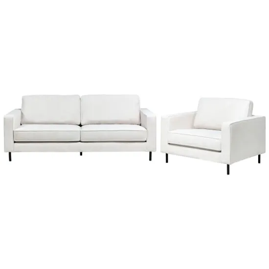 Zestaw do salonu o klasycznym designie, ktory sprawdzi się doskonale w wielu aranżacjach wnętrz. Dzięki miękkim, wygodnym poduchom na siedziskach i oparciach, zestaw zapewnia komfort odpoczynku aż czterem osobom, co czyni go idealnym na wieczory filmowe z rodziną czy przyjaciołmi. Tapicerka z gładkiej, przyjemnej w dotyku tkaniny poliestrowej dodaje wnętrzu elegancji i przytulności, a jej subtelny połysk podkreśla unikalny charakter kompletu. Prezentowany zestaw wprowadzi ciepło i styl do każdego salonu.Kolor Złamana bielLiczba miejsc 4Materiał tkanina poliestrowaModel SAVALEN