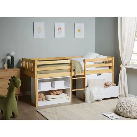 Solidna rama Łożka do pokoju dz Łożko na podwyższeniu Susville 90 x 200 cm to praktyczne i stylowe rozwiązanie do pokoju dziecięcego lub młodzieżowego. Wykonane z litego drewna kauczukowego, malowanego na jasny, naturalny kolor, łożko wniesie do wnętrza przytulną atmosferę w stylu skandynawskim. Solidna rama łożka i listwy pod materacem zapewniają trwałość i stabilność. Łożko jest odpowiednie na materac o wymiarach 90 x 200 cm. Najważniejsze cechy produktu:solidne wykonanie z litego drewna kauczukowego - malowane na jasny, naturalny kolor, co dodaje wnętrzu przytulnościstyl skandynawski - łożko wprowadza do pokoju dziecięcego lub młodzieżowego ciepłą atmosferępodwyższone łożko - praktyczne rozwiązanie, ktore tworzy dodatkową przestrzeń do zagospodarowaniatrwała i stabilna rama łożka - zapewnia długotrwałe użytkowanie i bezpieczeństwolistwy pod materacem - wzmacniają konstrukcję łożka Solidne drewno, z ktorego wykonano zarowno ramę jak i stelaż jest bardzo wytrzymałe oraz odporne na nacisk. Podwyższone łożko do pokoju dziecięcego jest bardzo funkcjonalne ponieważ pozwoli na zagospodarowanie przestrzeni w ciekawy sposob.Na przykład umieszczając pod nim biurko lub też tworząc miejsce do zabawy dla swojej pociechy. Łożko dziecięce posiada powierzchnię spania o wymiarach 90 x 200 cm i jest przystosowane pod materace o tej samej wielkości. Długość spania 200 cmgłębokość 207 cmKolor Jasne drewnoMateriał drewno kauczukoweSzerokość 97 cmSzerokość spania 90 cmWysokość 99 cm