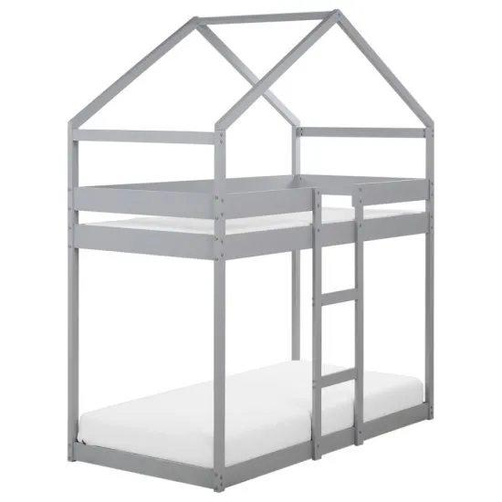 łożko piętrowe labatut 90 x 200 cm drewno szary Nowoczesne łożko piętrowe to idealne rozwiązanie do pokoju dziecięcego lub młodzieżowego, zwłaszcza tam, gdzie liczy się oszczędność miejsca. Wykonane jest z drewna, pomalowanego na elegancki szary kolor, ktory wprowadza do wnętrza nowoczesny i uniwersalny klimat. Konstrukcja łożka jest solidna i stabilna, co gwarantuje bezpieczeństwo i długotrwałe użytkowanie. Dolne łożko jest ustawione poziomo, podczas gdy gorne jest prostopadłe, co tworzy interesującą i praktyczną kompozycję. Dzięki materacom o wymiarach 90 x 200 cm, łożko zapewnia komfortowy sen dla dwoch osob.Piętrowe ułożenie łożek pozwala zaoszczędzić miejsce w pokoju, tworząc dodatkową przestrzeń do zabawy lub nauki. To łożko piętrowe nie tylko spełnia praktyczne funkcje, ale także dodaje wnętrzu stylowego charakteru, dzięki swojemu nowoczesnemu designowi i starannemu wykonaniu. Warto podkreślić, że łożko jest rownież przyjazne dla użytkownikow – jego wymiary i kształt zostały zaprojektowane z myślą o zapewnieniu maksymalnego komfortu zarowno podczas snu, jak i codziennego użytkowania.Dzięki swojej uniwersalności i praktyczności, piętrowe łożko drewniane świetnie wpisuje się w rożnorodne aranżacje wnętrz, dodając im przytulności i funkcjonalności. Wykonane z drewna malowanego na szary kolor Nowoczesny design Stabilna i wytrzymała konstrukcja Materace o wymiarach 90 x 200 cm. głębokość 206 cmKolor SzaryMateriał drewno sosnoweSzerokość 92 cmWysokość 230 cm