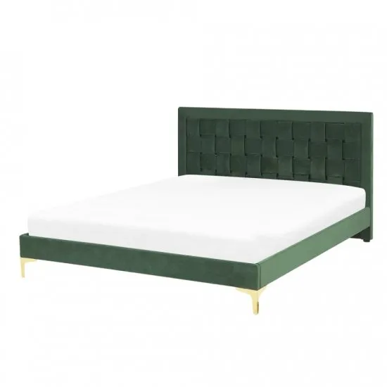 Łożko welurowe 160 x 200 cm zielone.Duże i niesamowicie wygodne łożko to obowiązkowy element w każdej sypialni - u nas znajdziesz szeroki wybor łożek, ktore bez problemu dopasujesz do swojego wnętrza! Zielone łożko Limoux jest tapicerowane wysokiej jakości welurem. Tkanina zastosowana w łożku sypialnianym Limoux jest trwała i odporna na uszkodzenia, a także nadaje mu elegancki wygląd. Wysokie wezgłowie łożka zwiększa komfort użytkowania oraz dodaje luksusowego szyku. Przestrzeń spania to 160 x 200 cm, co pozwala na komfortowy wypoczynek dla dwoch osob. Solidna konstrukcjaMetalowy stelaż, solidna drewniana rama oraz nożki gwarantują wytrzymałość oraz stabilność.Nowoczesny designWysokie wezgłowie ozdobione jest przeszyciami układającymi się we wzor kwadratow dodając eleganckiego i stylowego wyglądu.Welurowa tkaninaMiękka w dotyku, welurowa tkanina w pięknym, zielonym odcieniu wygląda wyjątkowo szykownie. Długość spania 200 cmgłębokość 213 cmKolor zielonyMateriał WelurMateriał Ramy drewnoMateriał stelaża MetalSzerokość 167 cmSzerokość spania 160 cmWysokość 97 cm