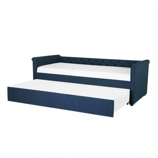Nowoczesne i wygodne łożko wysuwaneProste i praktyczne łożko wyrożnia się nowoczesnym designem i funkcjonalnością. Tapicerowane jest wytrzymałą tkaniną w eleganckim, niebieskim kolorze, co sprawia, że nie tylko wygląda stylowo, ale rownież jest trwałe. Solidna rama wykonana z płyty wiorowej zapewnia wytrzymałość i stabilność konstrukcji, co jest kluczowe dla długotrwałego użytkowania. Łożko wyposażone jest w metalowe wysuwane nogi, ktore ułatwiają przemianę dolnej części w dodatkowe łożko, co czyni je idealnym rozwiązaniem do pokoju gościnnego lub młodzieżowego. Komfort i wymiaryMaterac gorny ma powierzchnię leżenia o wymiarach 80 x 200 cm, natomiast dolny 80 x 197 cm, co zapewnia wygodę zarowno dla dorosłych, jak i dla dzieci. Wysokość powierzchni leżenia wynosi 42 cm, co ułatwia wstawanie i kładzenie się na łożko. Wysokość mebla to 75 cm, a jego szerokość to 215 cm.Praktyczność i stylNowoczesne łożko wysuwane to doskonałe połączenie stylu i funkcjonalności. Jego elegancki wygląd i praktyczność sprawiają, że doskonale wpasuje się w wystroj rożnych pomieszczeń, dodając im nie tylko stylu, ale rownież oferując wygodne miejsce do spania dla gości lub domownikow. Długość materaca dolnego 197 cmDługość materaca gornego 200 cmKolor NiebieskiMateriał poliester metal płyta wiorowaMateriał nog MetalMateriał Ramy Płyta wiorowaMateriał tapicerki poliesterSzerokość 215 cmSzerokość materaca dolnego 80 cmSzerokość materaca gornego 80 cmWysokość 75 cmWysokość powierzchni leżenia 42 cm
