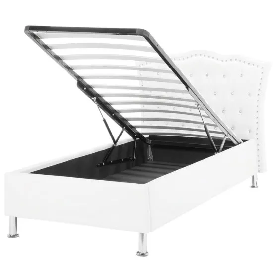 Łożko ze schowkiem - praktyczność i nowoczesny stylSzukasz praktycznego, a zarazem nowoczesnego łożka? Spojrz na model METZ od marki BELIANI.posiada wbudowany schowek na pościelpowierzchnia materaca: 90 x 200 cmzostało obite białą ekoskorąnowoczesny designŁożko posiada podnoszony stelaż, pod ktorym znajduje się praktyczny schowek, do ktorego włożysz pościel czy też inne akcesoria. Posiada wymiary odpowiednie dla materaca 90 x 200 cm, będzie więc nadawać się dla jednej osoby. Obite zostało białą ekoskorą, ktora dodaje szyku i elegancji, a dodatkowo wpasuje się w każde wnętrze. Wyposażone zostało rownież w stylowe wezgłowie, ktore ociepli Twoje wnętrze, a także będzie przydatne podczas wieczorow z książką czy też filmem. Postaw na praktyczność połączoną z elegancją i wybierz łożko Metz! Nowoczesny wystroj sypialniŁożko METZ doskonale wpasuje się we wnętrza utrzymane w stylu glamour lub nowoczesnym. Jego designerski wygląd podkreśli luksusowy charakter pomieszczenia, a neutralna kolorystyka pozwoli na łatwe dopasowanie do rożnych aranżacji. Długość materaca 200 cmgłębokość 217 cmKolor BiałyMateriał skora ekologicznaSchowek TakSzerokość 126 cmSzerokość materaca 90 cmWysokość 102 cm