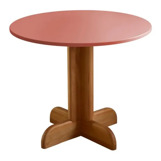 Okrągły stolik z centralną, drewnianą nogą świetnie nadaje się do małych pomieszczeń. Blat dostępny w wielu kolorach.