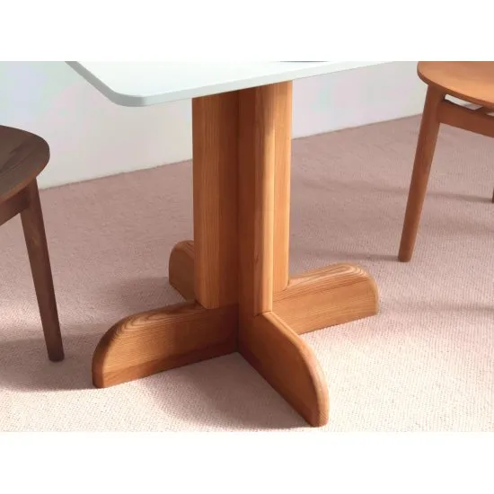 Kwadratowy stolik do kuchni z centralną, drewnianą nogą świetnie nadaje się do małych pomieszczeń. Blat dostępny w wielu kolorach.