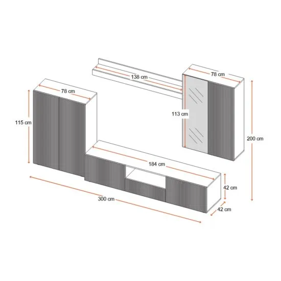 Całość wykonano z solidnego laminatu, a fronty powstały z płyty MDF pokrytej folią w połyskującym wykończeniu, ktore pięknie odbija światło. Szuflady osadzono na niezawodnych prowadnicach rolkowych, gwarantujących wygodne i ciche użytkowanie. Zestaw łączy w sobie część stojącą, wiszącą oraz praktyczną połkę, tworząc spojną kompozycję o wymiarach 300 × 42 × 200 cm.