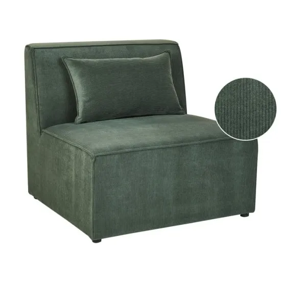 Zaaranżuj stylowo przestrzeń w swoim salonie korzystając z możliwości tej 1-osobowj sekcji. Aksamitne w dotyku, sztruksowe obicie o charakterystycznej prążkowanej strukturze, nadaje modułowi elegancki wygląd, dodatkowo mebel jest wsparty na nożkach wykonanych z materiału syntetycznego. Połącz ten segment z innymi elementami modułowymi, zestawiając je razem w wybranej kombinacji lub ustaw osobno w dowolnym miejscu w salonie.głębokość 83 cmKolor CiemnozielonyKształt ProstokątnyMateriał SztruksMateriał nog syntetycznySzerokość 83 cmWysokość 78 cm