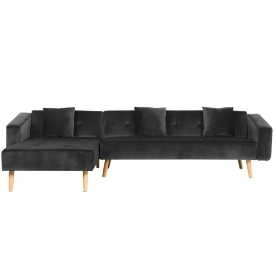 Narożnik welurowy prawostronny rozkładany czarny VADSOPoszukujesz eleganckiego narożnika, ktory idealnie dopełni wystroj Twojego salonu? Duży narożnik prawostronny z serii Vadso sprawdzi się doskonale dla Ciebie i Twoich najbliższych. Miękki materiał i jego obicie doceni każdy, kto choć raz usiądzie na tej sofie. Dzięki funkcji rozłożenia, narożnik Vadso można zamienić na łożko, a pojemnik zwiększający powierzchnię przechowywania, ułatwi zachowanie porządku w salonie. Narożnik Vadso posiada połyskujący i przyjemny w dotyku materiał z weluru w klasycznym, czarnym kolorze. Metalowe nożki w srebrnym kolorze dodają mu stylu i elegancji. Proste linie podkreślają nowoczesny design mebla. Narożnik obity jest z każdej strony, co pozwala na dowolną aranżację w pomieszczeniu. Cechy - Narożnik Welurowy Vadsomateriał: welur szerokość: 303 cm wysokość: 72 cm głębokość: 98 cmduże wymiary pozwala na posadzenie dużej ilości gości praktyczna funkcja rozkładania narożnik zamienia się w łożko pojemnik na pościel lub poduszki/koce prawy układprzyjemny w dotyku, połyskujący materiał z welurustylowy, klasyczny czarny kolormetalowe nożki w srebrnym kolorze nowoczesny design proste linie głębokość 98 cmKolor czarnyKolor nog srebrnyMateriał WelurMateriał nog MetalPojemnik na pościel TakRozkładany TakSeria VADSOSzerokość 303 cmUkład prawyWysokość 72 cm