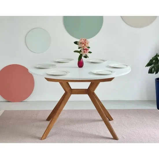 Okrągły rozkładany stoł dla 6 osob wsparty na solidnych drewnianych nogach. Przedłużenie blatu wewnątrz stołu. Dostępny w wielu kolorach.