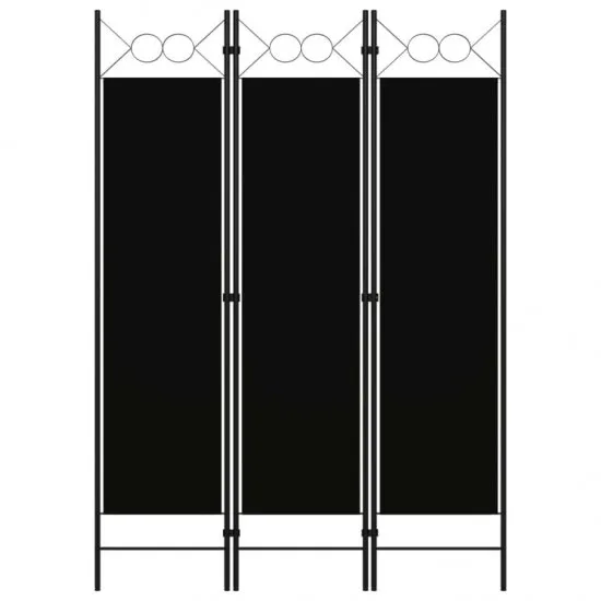Nasz wolnostojący, praktyczny, 3-panelowy parawan sprawdzi się jako przegroda, element wydzielający prywatną przestrzeń lub jako dekoracja. Gwarantuje on prywatność w sypialni lub wygrodzenie części pokoju. Gorna część z okrągłymi elementami stanowi elegancki dodatek. Wykonany z malowanej proszkowo, żelaznej ramy i tkaniny parawan można bez trudu złożyć, gdy nie jest używany. Uwaga: tkanina nie blokuje światła całkowicie.Kolor: czarny Materiał: tkanina (100% poliester), malowane proszkowo żelazo Wymiary całkowite: 120 x 180 cm (szer. x wys.) Wymiary panelu z tkaniny (każdego): 36,5 x 135 cm (szer. x wys.) Z 3 panelami Gorna część ozdobiona kołkami Wymagany montaż: tak Kolor czarnyLiczba paneli 3Materiał poliester żelazoMontaż wymagany TakSzerokość 120 cmSzerokość panelu 36,5 cmWaga 3,14 kgWysokość 180 cmWysokość panelu 135 cm