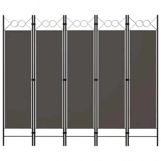 Nasz wolnostojący i praktyczny parawan 5-skrzydłowy sprawdzi się jako przegroda, osłona zapewniająca prywatność lub jako dekoracja. Oferuje on intymność w sypialni lub wygrodzenie części pokoju. Gorna część z okrągłymi elementami stanowi elegancki dodatek. Wykonany z malowanej proszkowo, żelaznej ramy i tkaniny parawan można bez trudu złożyć, gdy nie jest używany. Uwaga: tkanina nie blokuje światła całkowicie.Kolor: antracytowy Materiał: tkanina (100% poliester), malowane proszkowo żelazo Wymiary całkowite: 200 x 180 cm (szer. x wys.) Wymiary panelu z tkaniny (każdego): 36,5 x 135 cm (szer. x wys.) 5-panelowy Gorna część ozdobiona kołkami Wymagany montaż: tak Kolor antracytowyLiczba paneli 5Materiał żelazo poliesterMontaż wymagany TakSzerokość 200 cmSzerokość panelu 36,5 cmWaga 5,02 kgWysokość 180 cmWysokość panelu 135 cm