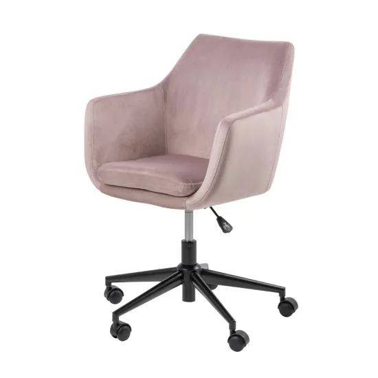 Spędzasz przy biurku dużo czasu, pracując lub relaksując się? O odpowiedni poziom komfortu podczas siedzenia zadbasz z wyjątkowym fotelem biurowym Marcelio! Dzięki odpowiedniemu wyprofilowaniu i starannemu wykonaniu ten czarujący mebel zadba o właściwe ułożenie Twojego ciała podczas korzystania z komputera, co pomoże Ci uniknąć bolu i sztywnienia mięśni. Korpus produktu obito przyjemną w dotyku tkaniną welurową, ktora zachwyci Cię nie tylko swoim szykownym wyglądem, ale także wysoką odpornością na ścieranie i rozdarcia. Całość wsparto na metalowej nodze o pięcioramiennej podstawie – taka budowa sprawia, że element zapewni doskonałą stabilność i brak niepożądanego kołysania. Fotel wyposażony został w nowoczesny gazowy podnośnik, zatem bez problemu dopasujesz jego wysokość do swoich preferencji. Szczegoły produktu: materiał obiciowy jest odporny na pilling oraz na wybielające działanie światła, korpus w kolorze przybrudzonego rożu pięknie komponuje się ze srebrno-czarną podstawą,