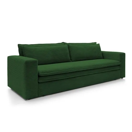 Poszukujesz stylowej kanapy, ktora skradnie Twoje serce? Kolekcja Baptello zachwyca swoją ponadczasową formą oraz wykończeniem! Kanapa Baptello to minimalistyczna, smukła bryła, ktora idealnie odnajdzie się w większości nowoczesnych aranżacji. Jest to mebel, ktory niewątpliwie nada charakteru Twojemu wnętrzu, dzięki prążkowanej sztruksowej tkaninie. Praktyczna funkcja spania typu Smart powoduje, że możesz całą konstrukcję zamienić w wygodne łożko, na ktorym wyśpią się członkowie Twojej rodziny czy odwiedzający Cię goście. Miejsce na pościel? Nie ma sprawy! Baptello posiada praktyczny pojemnik na pościel. Już dziś wybierz Baptello w jednym z dziewięciu kolorow i ciesz się gustownym meblem w swoim domu! Szczegoły produktu: model wolnostojący (z tapicerowanymi plecami), prosta w obsłudze funkcja spania typu Smart, praktyczny pojemnik na pościel w standardzie, mebel obito tkaniną Poso 14 w kolorze ciemnozielonym, Poso to tkanina meblowa stylizowana na sztruks. Jej powierzchnię pokrywają