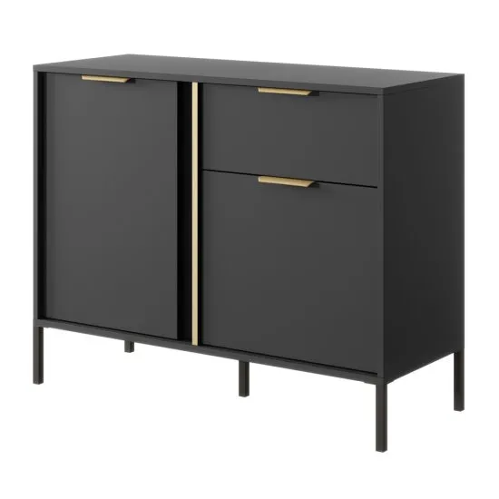 Poszukujesz nowoczesnych mebli do salonu, ktore zaskoczą Twoich gości? Wybierz kolekcję Molars i stworz wnętrze niczym z magazynow wnętrzarskich! Komoda dwudrzwiowa Molars to połączenie antracytowych frontow z modnym złotem, ktore gwarantuje powiew świeżości i nowoczesności. Szafka posiada dwa zamykane schowki z połkami, ktore świetnie sprawdzą się w roli miejsca na książki, gry planszowe lub elementy garderoby oraz pojemną szufladę, w ktorej pomieszczą się wszystkie mniejsze akcesoria. Dodatkowym atutem są złote dodatki w postaci uchwytow oraz pionowego obrzeża, ktore dodają całości stylu. Szczegoły produktu: korpus i fronty wykonane z laminowanej płyty wiorowej E05 o grubości 16 mm w kolorze antracyt, konstrukcja wzmocniona obrzeżami ABS, ktore nadają jej stabilności i wytrzymałości, delikatne, krawędziowe uchwyty w kolorze złotym nie obciążają konstrukcji, jednocześnie nadając funkcjonalności, wysokie, metalowe nogi w czarnym kolorze ułatwiają utrzymanie porządku pod meblem,