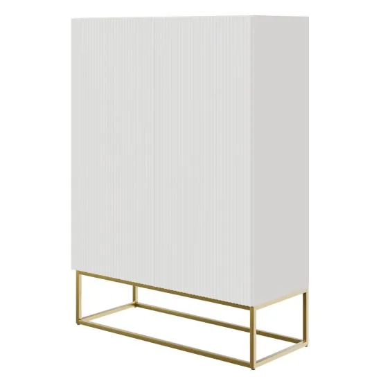 Zorganizuj przestrzeń swojego salonu lub sypialni z Komodą dwudrzwiową Veldio z frezowanym frontem 90 cm. To designerskie rozwiązanie łączące minimalistyczną biel z luksusowym wykończeniem w stylu glamour. Dzięki wysokiej konstrukcji zyskujesz mnostwo miejsca do przechowywania, oszczędzając jednocześnie cenną powierzchnię podłogi. Dlaczego warto wybrać komodę Veldio? Eleganckie frezowania (ryfle): Fronty z płyty MDF ozdobione pionowymi lamelami nadają bryle lekkości i szyku, co zapewnia unikalny i bardzo nowoczesny charakter Twojego wnętrza. Złota podstawa ze stali: Solidny stelaż malowany proszkowo gwarantuje wieloletnią stabilność, a jego forma nadaje wnętrzu trojwymiarowości i unikalnego wyglądu. Komfortowy system push to open: Brak tradycyjnych uchwytow zachowuje minimalistyczną formę mebla i pozwala na błyskawiczne otwieranie drzwi, nawet gdy masz zajęte ręce. Specyfikacja i materiały Wykonanie korpusu Płyta laminowana 16 mm (Kronospan 110 PE) – podwyższona odporność na wilgoć i