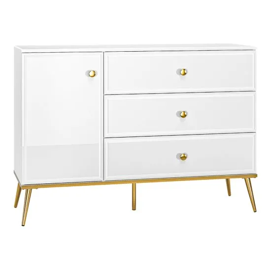 Chcesz, aby Twoje wnętrze było pełne elegancji i połysku? Z kolekcją mebli Darrby z pewnością Ci się to uda! Komoda jednodrzwiowa Darrby znajdzie swoje miejsce zarowno w sypialni, jak i w pokoju dziennym. Charakteryzuje się prostą bryłą, ktorej uroku nadają złote elementy oraz częściowo połyskujące wykończenie - w takiej formie doskonale odnajdzie się wnętrzach urządzonych w stylu glamour. Wnętrze komody stanowią trzy szuflady oraz zamykana szafka, z połką wewnątrz. Taki podział pozwoli przechowywać przedmioty według Twoich preferencji, z zachowaniem porządku w pomieszczeniu. Atutem komody są rownież wysokie nożki, ktore bez problemu pozwolą utrzymać czystość pod meblem, zarowno Tobie, jak i robotom sprzątającym. Szczegoły produktu: wykonanie korpusu: płyta laminowana, frontow: płyta MDF, krawędzie zabezpieczone obrzeżem ABS, ktore chroni przed uszkodzeniami mechanicznymi, wykonanie uchwytow i nożek: metal w kolorze złotym, mebel wyposażony w cichy domyk, szuflady wyposażone w pełny