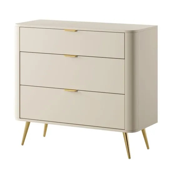 Znudziły Ci się klasyczne formy mebli? Chcesz odmienić swoje mieszkanie? Wybierz kolekcję Oval i zaskocz wszystkich gości! Komoda Oval to nowoczesny mebel, ktory zaskakuje swoim kształtem. Zaokrąglone brzegi dodają elegancji i czynią go przyjaznym dla dzieci. Komoda posiada trzy, pojemne szuflady, ktore pomieszczą wszystko czego potrzebujesz: drobne sprzęty elektroniczne, dokumenty, elementy garderoby czy artykuły biurowe. Dodatkowym atutem jest blat, na ktorym możesz ustawić elegancki wazon, zdjęcia bliskich czy świeże kwiaty. Nowoczesny kształt dodaje lekkości wnętrzu i czyni je bardziej przytulnym. Szczegoły produktu: korpus i fronty wykonane z laminowanej płyty meblowej Pfleiderer U16003 w kolorze Beż piaskowy, konstrukcja wzmocniona obrzeżami ABS, ktore nadają jej stabilności i wytrzymałości, wysokie, stalowe nożki wykończone w chromowanym złocie posiadają niewielkie, białe stopki, ktore zapobiegają rysowaniu podłogi, szuflady umieszczone na prowadnicach kulkowych 27 mm, delikatne