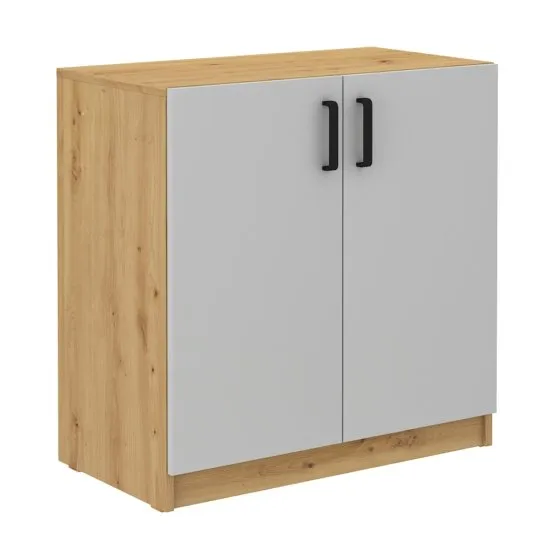Poszukujesz nowoczesnych mebli biurowych, ktore sprostają wszystkim Twoim oczekiwaniom? Przedstawiamy kolekcję Stundly, ktora dostosowuje się do Ciebie i Twoich potrzeb! Komoda Stundly to funkcjonalne i stylowe rozwiązanie, idealnie pasujące do nowoczesnego wnętrza. Jej design łączy w sobie elegancję naturalnego koloru z nowoczesnymi akcentami, tworząc harmonijną i atrakcyjną całość. Mebel wykonany jest z trwałego materiału, jakim jest płyta laminowana w kolorze dąb artisan i szarym, co nadaje mu przyjemną teksturę i wygląd naturalnego drewna. Ten dobor kolorow jest subtelny i uniwersalny, łatwo komponujący się z rożnymi kolorami ścian i mebli. Komoda posiada cztery wnęki, ktore umożliwiają przechowywanie rożnych przedmiotow. Dzięki takiemu podziałowi jest wszechstronna i doskonale sprawdzi się w biurze jako miejsce do przechowywania ważnych dokumentow, narzędzi pisarskich, sprzętu elektronicznego czy książek. Drzwi pozwalają zakryć nieporządek lub mniej estetyczne przedmioty. Czarne