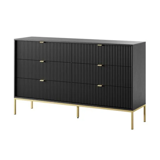 SELSEY Komoda sześcioszufladowa Vellore 154 cm czarna z ryflowanymi frontami i złotym stelażem