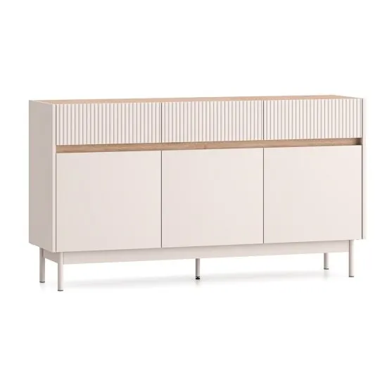 Szukasz eleganckich mebli, ktore wprowadzą nowoczesny klimat do Twojego wnętrza? Kolekcja Dunea to idealne rozwiązanie, łączące funkcjonalność z minimalistycznym stylem. Komoda trzydrzwiowa Dunea została zaprojektowana z myślą o miłośnikach nowoczesnego designu. Wykonana z wysokiej jakości płyty laminowanej, zapewnia trwałość i łatwość pielęgnacji. Matowe fronty w kolorze kaszmiru dodają elegancji, a delikatne nożki dodają lekkości. Połączenie kaszmiru z dębem cremona i ryflowaniami sprawia że bryła nie jest nudna. Połki oferują przestrzeń do schowania wszystkich potrzebnych rzeczy a szuflady stanowią dodatkowe miejsce do przechowywania drobnych przedmiotow. Dzięki cichemu domykowi i nożkach, szafka jest nie tylko stylowa, ale także praktyczna i wygodna w użytkowaniu. Zamow komodę Dunea i odmień swoje wnętrze! Szczegoły produktu: korpus i fronty wykonany z płyty laminowanej w kolorze Cashmere U12168, gorny blat wykonany z płyty laminowanej Dab Cremona Torro 2738 PW, wstawki na froncie