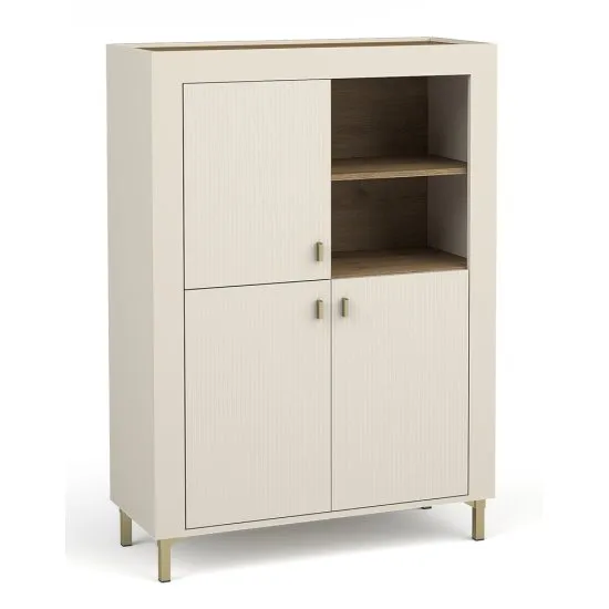 Szukasz idealnej komody do swojego wnętrza, ktora nie tylko zapewni praktyczne rozwiązanie do przechowywania, ale także będzie wyjątkowym elementem wystroju? Wysoka komoda Lammila o wyjątkowym designie będzie świetnie komponowała się z nowoczesnymi wnętrzami. Kolor beżowy nadaje jej delikatnego, naturalnego uroku, ktory doskonale komponuje się z rożnymi aranżacjami wnętrz. Natomiast blat i połki w kolorze dębu whisky dodają mu ciepła, tworząc harmonijną kombinację kolorystyczną. Z kolei wyrafinowany detal w postaci pionowych listew na frontach dodaje wyjątkowego wyglądu całej szafce. Została zaprojektowana z myślą o funkcjonalności, więc posiada osiem połek, gdzie umieścisz rożnego rodzaju przedmioty, zależnie od Twoich potrzeb. Dzięki złotym uchwytom oraz nożkom, całość prezentuje się lekko i bardzo stylowo. Kolekcja Lammila - wybierz doskonałość dla swojego wnętrza już dziś! Szczegoły produktu: konstrukcja wykonana z płyty wiorowej laminowanej Kaszmirowy Beż PU1506 SO, wykonanie
