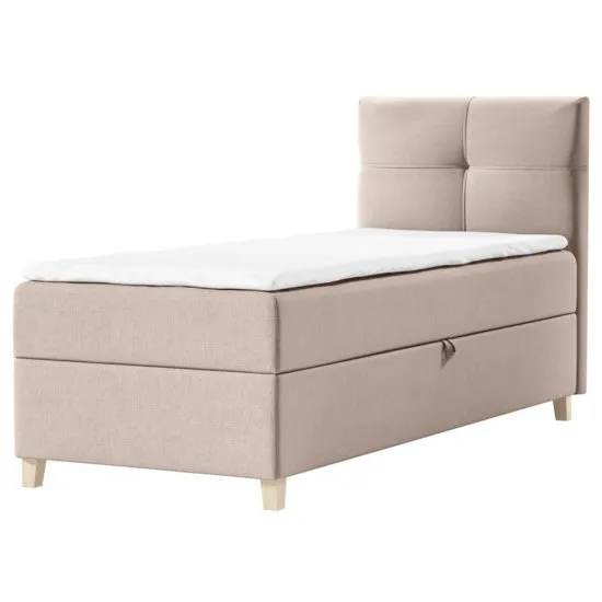 Marzysz o tym, aby każda noc spędzona była w atmosferze komfortu? W osiągnięciu takiego rezultatu pomoże wygodne łożko kontynentalne z serii Firmini! Łożko kontynentalne z serii Firmini to wybor doskonały dla każdego miłośnika klasycznych rozwiązań i maksymalnej wygody. Wszystko za sprawą średnio twardego materaca bonellowego z topperem z miękkiej pianki T25. Bazą konstrukcji są wytrzymałe nożki z drewna bukowego, a uroku całości dodaje wezgłowie z ozdobnym pikowaniem. Wnętrze łożka wykorzystasz jako praktyczny pojemnik na drobne przedmioty i tekstylia codziennego użytku. Warte uwagi jest także obicie mebla. Wykonano je z welurowej tkaniny Soro o plecionej strukturze. Materiał wykazuje odporność na ścieranie, tarcie, pilling i mechacenie. Nie płowieje także pod wpływem światła. Szczegoły produktu: nożki z wytrzymałego drewna bukowego, wysokość podstawy (bez materaca): 34 cm, powierzchnia spania: 90x200 cm, maksymalne obciążenie: 140 kg, posiada miękki topper o wysokości 4 cm (pianka