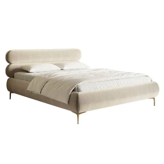 SELSEY Łóżko tapicerowane 180x200 cm Roule z pojemnikiem stelaż metalowy jasnobeżowe welur hydrofobowy nóżki złote