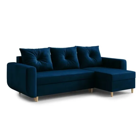 Zależy Ci na pięknym wystroju salonu? Koniecznie sprawdź nasz narożnik z funkcją spania Lamarry, ktory może Ci pomoc zrealizować marzenia! Narożnik rozkładany Lamarry to propozycja do nowoczesnego salonu. Mebel wyrożnia się ciekawymi, delikatnie zaokrąglonymi podłokietnikami, ktore nadają mu nietuzinkowego wyglądu. Całość dopełniają spore, pikowane poduchy oparciowe oraz wysokie, smukłe nogi. Takie rozwiązanie sprawiło, że całość prezentuje się niezwykle szykownie, dzięki czemu z łatwością dopasujesz ją do przestrzeni pełnej modernistycznych lub nowojorskich inspiracji. Sięgnij więc po neutralne kolory, odrobinę drewna i zieleni, a z łatwością uzyskasz fenomenalne rezultaty, ktore pozytywnie Cię zaskoczą. Narożnik Lamarry posiada przyjemną w użyciu funkcję spania typu DL. Pozwala ona szybko przemienić konstrukcję w komfortowe posłanie, na ktorych dobrze wyśpią się nocujący u Ciebie goście. Dodatkowym atutem narożnika jest to, że posiada pojemnik na pościel, w ktorym spokojnie zmieścisz