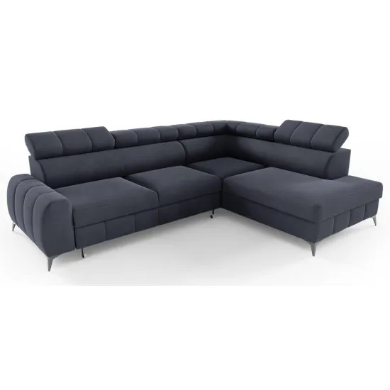 Szukasz narożnika, ktory łączy w sobie styl, funkcjonalność i komfort? Narożnik London to idealne rozwiązanie! Dzięki tapicerowanemu tyłowi, mebel ten prezentuje się doskonale w każdej aranżacji, stając się centralnym punktem Twojego salonu. Regulowane zagłowki zapewniają optymalne wsparcie dla głowy i szyi, umożliwiając pełen relaks podczas czytania lub oglądania telewizji. Narożnik London posiada funkcję spania typu delfin, co sprawia, że w mgnieniu oka przekształcisz go w wygodne łożko dla gości. Dodatkowo, pojemnik na pościel to praktyczne rozwiązanie, ktore ułatwia przechowywanie. Stelaż wykonany z solidnych materiałow, takich jak płyta wiorowa, MDF i drewno sosnowe, gwarantuje trwałość i stabilność. Wysokie metalowe nożki dodają nowoczesnego akcentu, a także ułatwiają sprzątanie pod meblem. Komfort użytkowania zapewnia oparcie wykonane z pianki poliuretanowej i pasa gumowego, ktore doskonale dopasowują się do kształtu ciała. Siedzisko wyposażone w sprężyny faliste oraz piankę