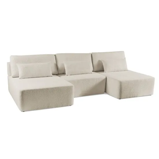 Szukasz dużego wielofunkcyjnego narożnika o obłym kształcie, idealnie dopasowującego się w obecne trendy wnętrzarskie? Dobrze trafiłeś! Przedstawiamy Ci kolekcję mebli modularnych Moduliano od ktorych nie będziesz mogł oderwać oczu! Moduliano to stylowy narożnik w kształcie litery U, składający się z trzech segmentow. Jego prosta budowa i obłe zarysy idealnie wpasują się do większości wnętrz, a dzięki możliwości rozdzielenia segmentow będziesz miał możliwość dowolnego przesuwania pojedynczych elementow. Miękkie, ozdobne poduszki pozwolą Ci przyjemnie rozłożyć się na narożniku, dzięki czemu zapomnisz o stresującym dniu. Siedzenie, jak i oparcie wypełnione są pianką poliuretanową oraz sprężynami bonellowymi sprawiając, że mebel ten jest niezwykle wygodny. Całości Moduliano dopełnia strukturalna tkanina typu boucle, ktora nadaje owej prostej bryle charakteru. Dodatkowo narożnik z łatwością można rozłożyć w wygodne łożko, na ktorym będziesz mogł przenocować znajomych lub rodzinę. Wszelkie