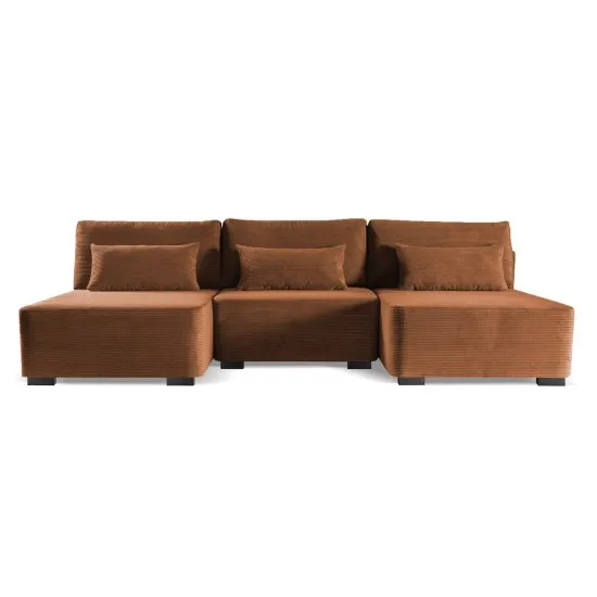 Szukasz dużego wielofunkcyjnego narożnika o obłym kształcie, idealnie dopasowującego się w obecne trendy wnętrzarskie? Dobrze trafiłeś! Przedstawiamy Ci kolekcję mebli modularnych Moduliano od ktorych nie będziesz mogł oderwać oczu! Moduliano to stylowy narożnik w kształcie litery U, składający się z trzech segmentow. Jego prosta budowa i obłe zarysy idealnie wpasują się do większości wnętrz, a dzięki możliwości rozdzielenia segmentow będziesz miał możliwość dowolnego przesuwania pojedynczych elementow. Miękkie, ozdobne poduszki pozwolą Ci przyjemnie rozłożyć się na narożniku, dzięki czemu zapomnisz o stresującym dniu. Siedzenie, jak i oparcie wypełnione są pianką poliuretanową oraz sprężynami bonellowymi sprawiając, że mebel ten jest niezwykle wygodny. Całości Moduliano dopełnia wyjątkowa sztruksowa tkanina, ktora nadaje owej prostej bryle charakteru. Dodatkowo narożnik z łatwością można rozłożyć w wygodne łożko, na ktorym będziesz mogł przenocować znajomych lub rodzinę. Wszelkie