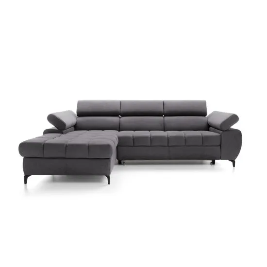 Marzysz o pięknym i funkcjonalnym salonie niczym z okładki najlepszego czasopisma wnętrzarskiego? Narożnik z funkcją spania Pernes to pierwszy krok do spełnienia tego marzenia! Pernes to zgrabna bryła o wspołczesnej formie, charakteryzująca się pikowanym siedziskiem i smukłymi, czarnymi nożkami. Dzięki takim atrybutom, mebel przyciągnie wzrok każdego gościa. Konstrukcja wyposażona jest w regulowane zagłowki oraz podłokietniki, co pozwoli Ci dostosować wysokość oraz kąt nachylenia do bieżącego zapotrzebowania. Korpus wypełniono miękką pianką wysokoelastyczną oraz profilowanymi sprężynami falistymi. Takie rozwiązanie znacząco podniesie komfort użytkowania i wpłynie pozytywnie na jakość Twojego wypoczynku. Narożnik posiada funkcję spania i mechanizm typu delfin, dzięki ktoremu w szybki i łatwy sposob przekształcisz go w wygodne łożko o obszernej powierzchni. Mebel zawiera rownież pojemny schowek na pościel, w ktorym przechowasz wszelkie niezbędne tekstylia. Szczegoły produktu: narożnik