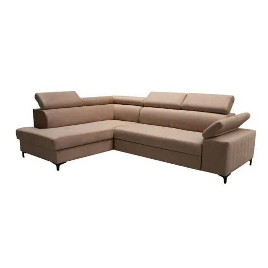 Śledzisz najnowsze trendy wnętrzarskie marząc o stylowym salonie? Wybierz czarujący narożnik Tazzola! Narożnik Tazzola łączy w sobie wspołczesny design oraz funkcjonalność. Konstrukcja w kształcie litery L oparta jest na smukłych nożkach w czarnym kolorze, ktore nadają całości wizualnej lekkości. Regulowane zagłowki pozwolą dostosować ich ułożenie do indywidualnych preferencji użytkownika, zaś tapicerowany tył umożliwia ustawienie mebla w dowolnej części pomieszczenia. Mebel wyposażono w funkcję spania, dzięki ktorej z łatwością przemienisz narożnik w wygodne posłanie, a w pojemnym schowku przechowasz zapasowy komplet pościeli czy inne tekstylia. Szczegoły produktu: narożnik jest L-kształtny, mebel jest lewostronny, regulowane zagłowki pozwalają dopasować wysokość i kąt nachylenia dostosowując narożnik do aktualnych potrzeb, długoś otomany: 162 cm, wysokość podłokietnikow: 60 cm / 71 cm, szerokość podłokietnikow: 30 cm, głębokość podłokietnikow: 97 cm, praktyczny pojemnik na pościel,