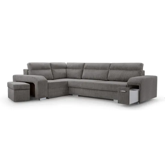 Jesteś osobą towarzyską i uwielbiasz spędzać czas w gronie bliskich? Z pomocą nadchodzi niezwykle funkcjonalny narożnik Umill, z ktorym zadbasz o komfort swojego kącika wypoczynkowego! Prosta, minimalistyczna bryła utrzymana jest w nowoczesnej stylistyce i prezentuje się doskonale w dużych wnętrzach. Mebel został obity miękką tkaniną Lincoln 90 przypominającą strukturą sztruks w ciekawym, ciemnoszarym odcieniu. Narożnik Umill L-kształtny to duża i wygodna powierzchnia do siedzenia, a do tego w jednym z podłokietnikow znajdziemy schowaną pufę, ktora może być dodatkowym siedziskiem lub podnożkiem. Drugi podłokietnik skrywa zupełnie inną i niecodzienną niespodziankę... wysuwany barek! To doskonały pomysł, gdy lubimy wypić na przykład lampkę wina do wieczornego seansu. W nocy narożnik może zmienić się w duże posłanie tworząc wygodne łożko. To jeszcze nie wszystko – Umill posiada aż dwa pakowne schowki na pościel. Szczegoły produktu: mebel L-kształtny, narożnik lewostronny, gęstość pianki