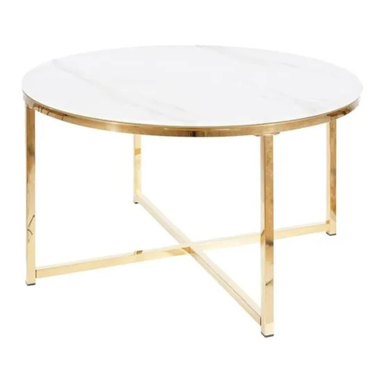 Szukasz mebli, ktore pomogłyby Ci w stylowy sposob zwieńczyć wystroj pokoju dziennego? Stolik kawowy z kolekcji Larchi, będzie idealnym wyborem! Stolik kawowy Larchi sprawdzi się w każdym nowoczesnym mieszkaniu. Nasz produkt wykonano z materiałow odpornych na korozję, nacisk oraz temperaturę, ktore są bardzo trwałe i solidne. Stolik ma okrągły blat o powierzchni ozdobionej wzorem imitującym biały marmur. Spoczywa on na prostych, złotych nogach, ktore połączone ze sobą, tworzą podstawę w kształcie krzyża. Mebel zostanie idealną bazą dla eleganckich filiżanek bądź kryształowej tacy z przekąskami. Dzięki niemu poczujesz się niezwykle wyjątkowo podczas popijania kawy lub herbaty w salonie. Stolik jako część nowoczesnego wyposażenia, ustawiony obok miękkiej sofy, zostanie prawdziwym klejnotem Twojej aranżacji o stylu glamour, boho chic, a nawet Quiet Glam. Szczegoły produktu: szklany stolik to perfekcyjny dodatek do luksusowego salonu, materiał frontu: szkło hartowane, charakteryzujące się