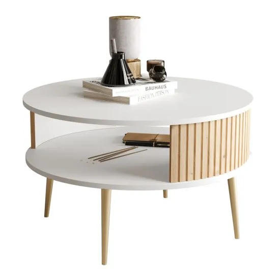 Nowoczesny i stylowy stolik kawowy? Przedstawiamy Piviano! Mebel charakteryzuje się elegancją i funkcjonalnością. Stanie się centralnym punktem każdego salonu, ale rownież zapewni dodatkową przestrzeń do przechowywania dzięki praktycznej połce umieszczonej pod blatem. Prosta bryła, wzbogacona modnymi lamelami, usytuowana została na wysokich nożkach, ktore zapewniają trwałość i stabilność konstrukcji. Dzięki nim bez problemu utrzymasz czystość pod meblem, zarowno samodzielnie jak i za pomocą robota sprzątającego. Szczegoły: wykonanie blatu: płyta laminowana 16 mm, wykonanie ryfli na bokach: płyta MDF, wykonanie nożek: metal, w kolorze szczotkowane złoto, wysokość połki: 17 cm, wysokość nożek: 23 cm, kolor blatu: biały, kolor ryfli: dąb artisan.