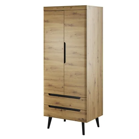Chcesz pięknie wyposażyć swoj dom? Szafa Livinella będzie idealnym rozwiązaniem! Mebel składa się z pojemnej wnęki z drążkiem na wieszaki oraz dwoch szerokich szuflad — dzięki temu pomieścisz w niej wszystko, czego potrzebujesz. Szafa jest niezwykle uniwersalna i świetnie odnajdzie się zarowno w salonie czy sypialni, jak i przedpokoju lub pokoju dziecięcym czy młodzieżowym. Szczegoły produktu: fronty oraz zaokrąglone listwy nad nimi to płyta MDF o grubości 18 mm, korpus wykonano z płyty laminowanej (16 mm), wysokie, smukłe nożki dodają nowoczesnego charakteru.