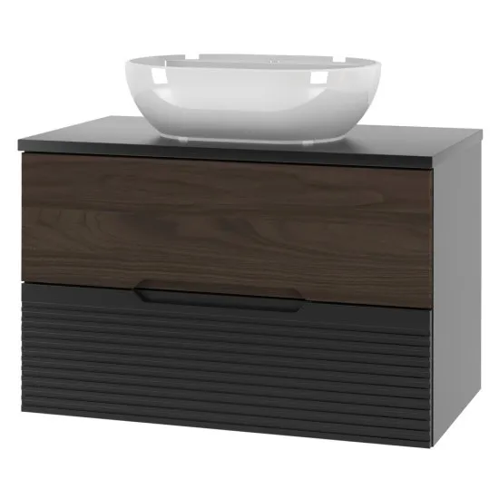SELSEY Szafka łazienkowa z blatem i umywalką nablatową Avella 80 cm ryflowany front czarny mat / orzech