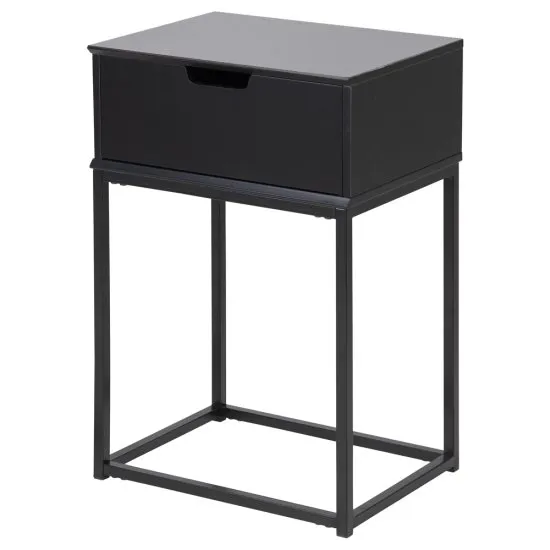 Marzysz o atrakcyjnie się prezentującym mieszkaniu, na widok ktorego zaniemowią Twoi przyjaciele? Kolekcja mebli Maudine okaże się zatem prawdziwym strzałem w dziesiątkę! Szafka nocna nowoczesna Maudine została stworzona specjalnie dla Ciebie! Nie wierzysz? Zastanow się zatem, czego potrzebujesz: nie będzie to przypadkiem zgrabny mebel, ktory doda funkcjonalności Twojej sypialni, jednocześnie wypełniając ją nowoczesnymi trendami? Jeśli tak, to masz już odpowiedź! Geometryczny, minimalistyczny design produktu świetnie komponuje się ze wspołcześnie urządzonymi, np. modernistycznymi, przestrzeniami, a czarne wybarwienie pozwala subtelnie uspokoić całą kompozycję. Gładki blacik oraz pojemna szuflada dbają zaś o to, by wszystkie niezbędne przedmioty znalazły się w zasięgu Twojej ręki! Szczegoły produktu: podstawa z malowanego proszkowo metalu pięknie się prezentuje, a do tego pochwalić się może wysoką stabilnością i odpornością na uszkodzenia, korpus wykonany z najwyższej klasy płyty MDF