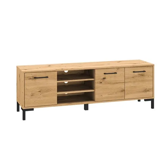 Szukasz mebli, dzięki ktorym Twoj salon będzie nie tylko funkcjonalny, ale rownież stylowy? Już śpieszymy z pomocą i przedstawiamy kolekcję mebli Ballarti! Szafka RTV Ballarti to niebanalny mebel, ktory ożywi Twoje wnętrze. Cechuje się prostą formą, usytuowaną na wysokich nożkach, ktore nadają bryle wizualnej lekkości. Cała konstrukcja składa się z trzech, zamykanych schowkow oraz trzech otwartych wnęk, ktore idealnie sprawdzą się jako miejsce na dekodery lub konsole do gier. Dodatkowo jeden schowek został podzielony połką, aby zapewnić maksymalną funkcjonalność mebla. Szczegoły produktu: korpus i fronty wykonane z płyty laminowanej odpornej na zarysowania oraz wilgoć, krawędzie zabezpieczone obrzeżem ABS, ktore chroni przed uszkodzeniami mechanicznymi, wykonanie uchwytow i nożek: tworzywo sztuczne, otwory w tylnej płycie pomogą uporządkować wszystkie kable, dodatkowa nożka na środku zapewnia większą stabilność całej konstrukcji.