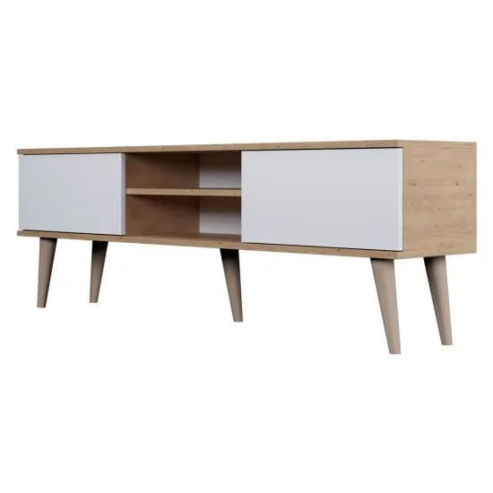 Jeśli cenisz sobie wnętrza urządzone w minimalistycznym stylu, to meble Damally z pewnością Cię zainteresują! Staranne wykonanie oraz pożądana przez wszystkich funkcjonalność to tylko część zalet tej nowoczesnej kolekcji. Szafka RTV Damally charakteryzuje się prostą bryłą, usytuowaną na wysokich nożkach z drewna dębowego, ktorego atutem jest twarda oraz zbita struktura - takie właściwości zapewnią Ci stabilny i trwały mebel na lata. Dzięki ciepłemu wybarwieniu korpusu w kolorze dębu artisan, Damally z powodzeniem odnajdzie się w nowoczesnych oraz skandynawskich aranżacjach. Białe fronty natomiast nadają całości szyku i elegancji, a także stanowią świetny kontrast dla odcienia dębu. Wnętrze podzielone zostało na dwie zamykane szafki oraz dwie otwarte połki. Taki podział pozwoli Ci zarowno ulokować niezbędny sprzęt RTV, jak i ukryć za frontem dodatkowe akcesoria z nim związane, np. pilot, zapasowe kable, czy kolekcja płyt z grami na konsolę. Szczegoły: wykonanie: płyta laminowana 18 mm,