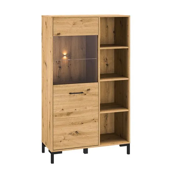 Szukasz mebli, dzięki ktorym Twoj salon będzie nie tylko funkcjonalny, ale rownież stylowy? Już śpieszymy z pomocą i przedstawiamy kolekcję mebli Ballarti! Witryna Ballarti to niebanalny mebel, ktory ożywi Twoje wnętrze. Cechuje się prostą formą, usytuowaną na wysokich nożkach, ktore nadają bryle wizualnej lekkości. Całość została podzielona na dwie części. W jednej znajdują się otwarte połki, ktore świetnie wyeksponują pamiątki z wakacji, rodzinne fotografie lub stylowe dodatki. W zamykanej części znajduje się przeszklenie, ktore nadaje całości elegancji i stylu. Dodatkowo możesz wybrać opcję z oświetleniem LED, ktore podkreśli design całego mebla. Szczegoły produktu: korpus i fronty wykonane z płyty laminowanej odpornej na zarysowania oraz wilgoć, krawędzie zabezpieczone obrzeżem ABS, ktore chroni przed uszkodzeniami mechanicznymi, wykonanie uchwytow i nożek: tworzywo sztuczne, możliwość montażu mebla otwieranego na lewą lub prawą stronę, możliwość dokupienia wariantu z 2 punktowym